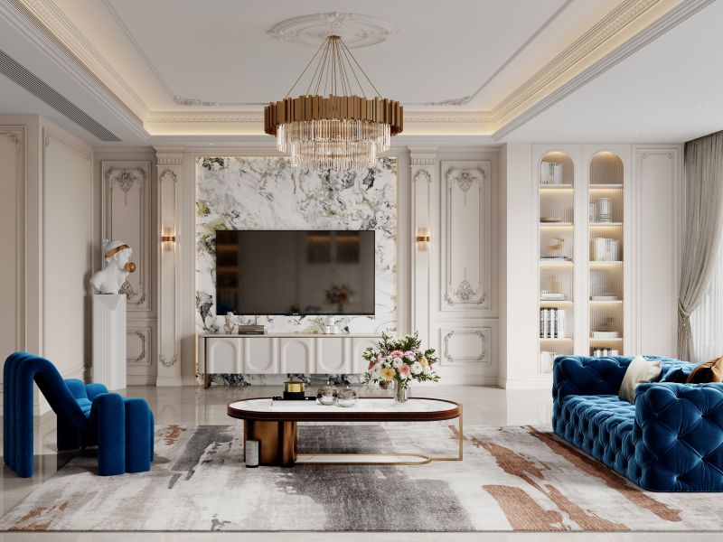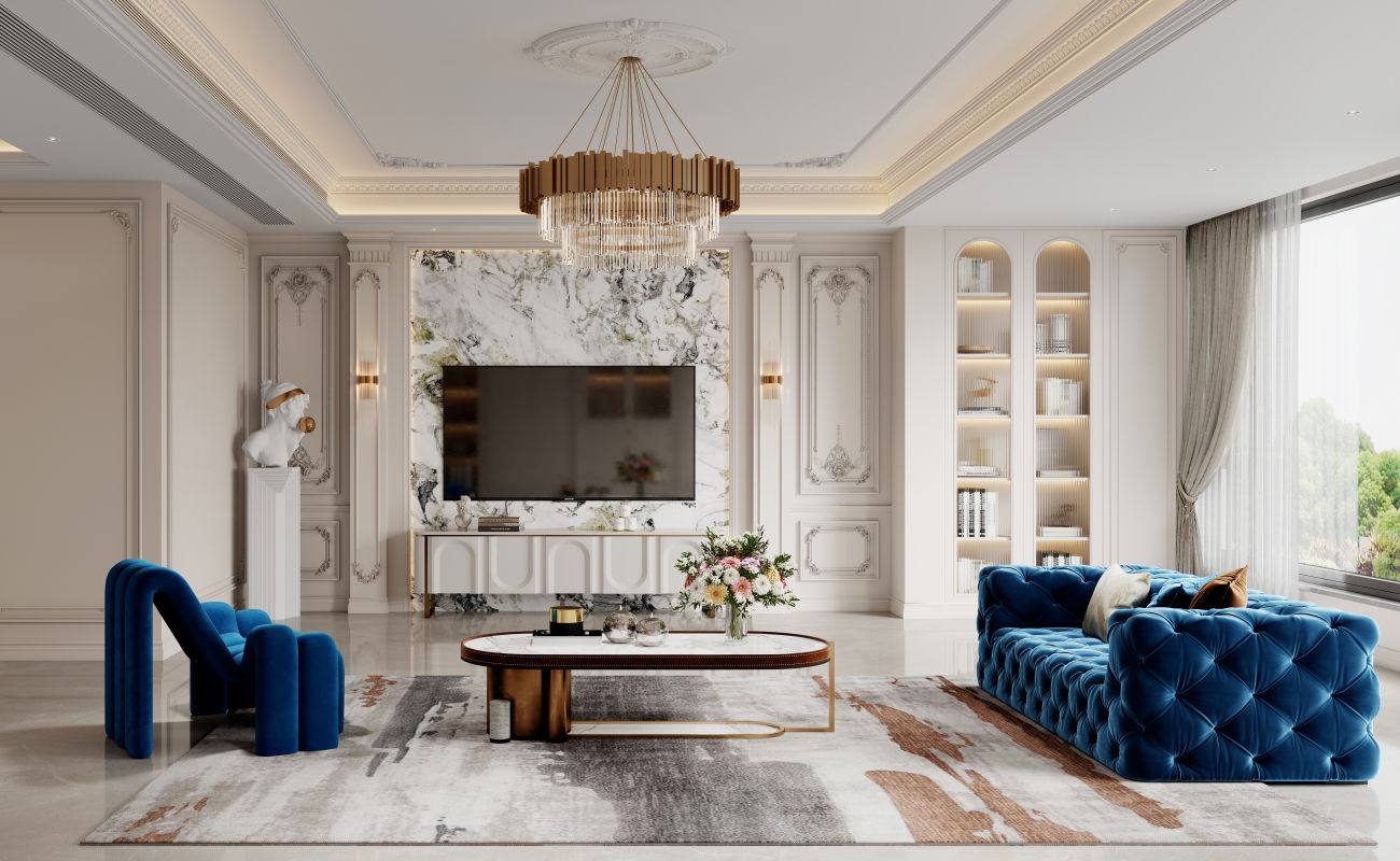 会客厅的设计摒弃了固化的风格,糅合了法式复古与摩登时尚元素,借用简约现代的设计手法呈现出优雅矜贵格调。孔雀蓝沙发成为空间的点睛之笔。