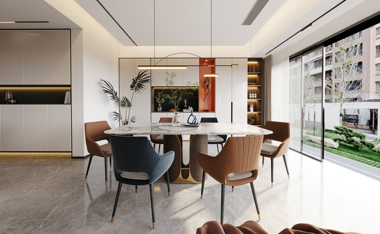 空间采用一体开放式设计,客厅与餐厅无缝衔接,视野通透,动线流畅。餐边柜作为“隐形收纳”的典范,遵循“藏八露二”的原则,将大量物品隐于柜门之后,中层开放格则贴心安置常用小家电,让储物与使用高效衔接。
