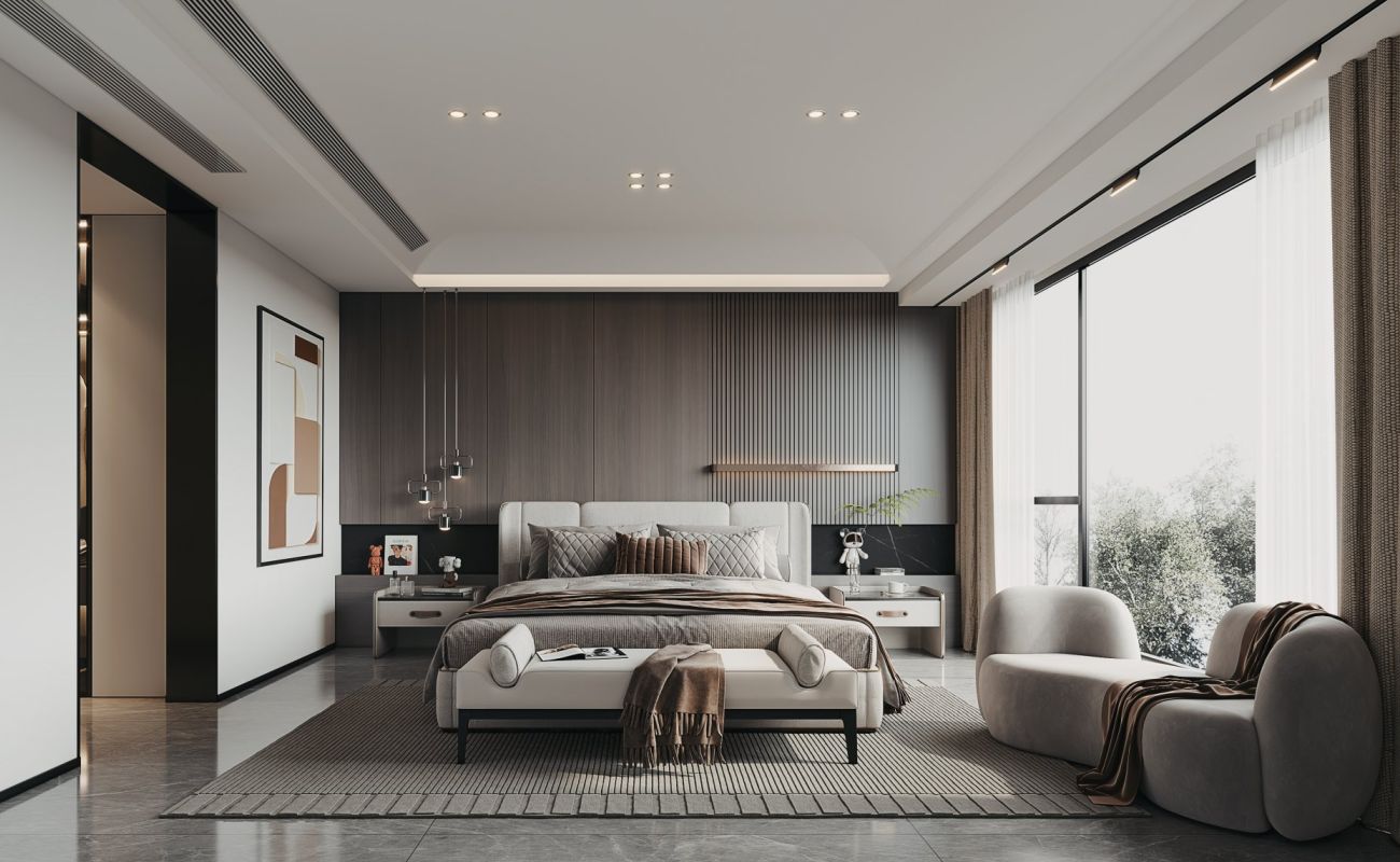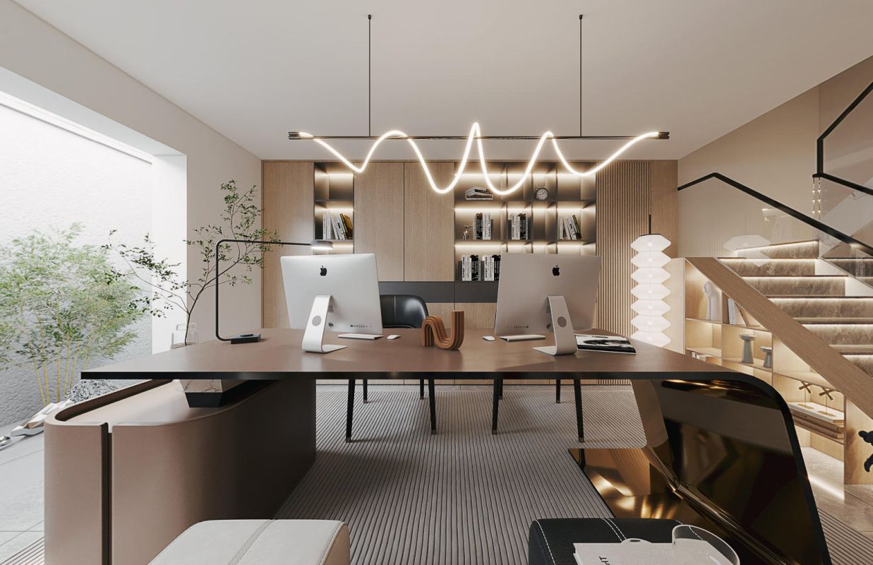 书房是一个集工作、休憩与观景于一体的精神居所。一方天井将自然光慷慨赠予,翠竹在天光下挺拔生长,透明的玻璃护栏将光线引入更深层。玻璃护栏如同一幅无框画作,将目光引向广阔的挑空区域,与负二层形成开阔而连续的视觉对话。