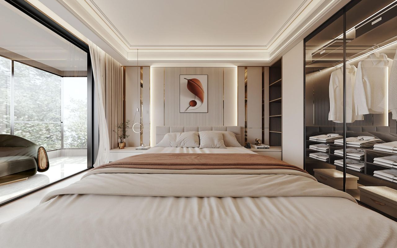 天窗将自然光引入,其正下方是方正围合的下沉式沙发区,一侧是高挑空的电视墙,拉伸着空间的视觉尺度;通透的到顶定制酒柜,通过镜面天花拉伸视觉层高,与精致的吧台无缝衔接。