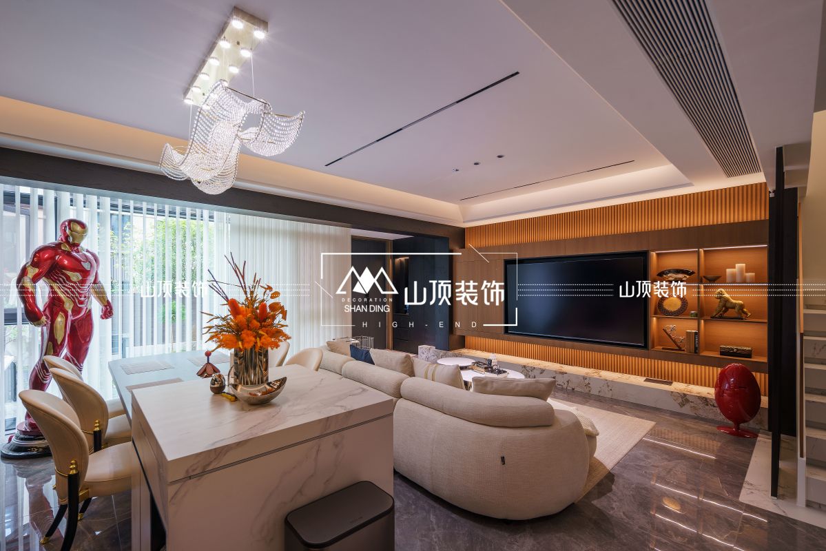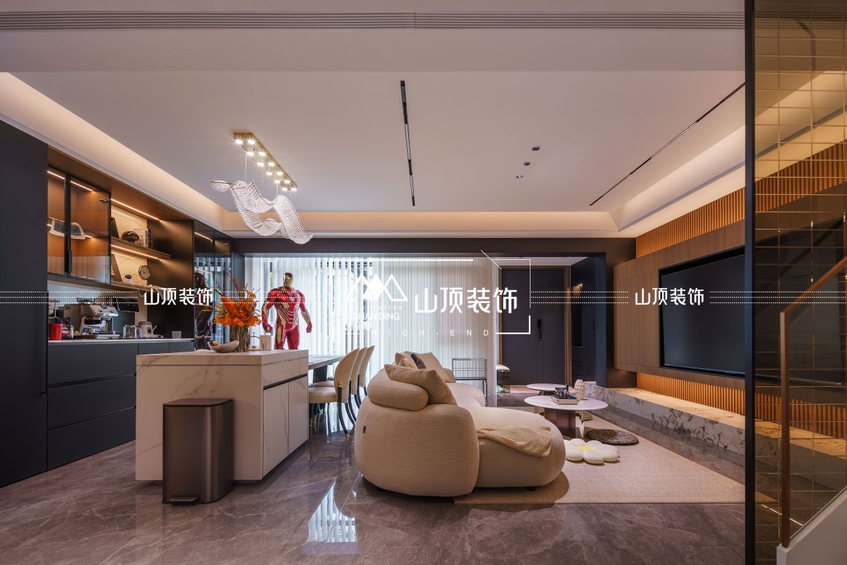 地下室空间凭借挑高设计尽显大气磅礴。步入其中,豪华水晶吊灯自高处垂落,熠熠生辉。大理石花纹的墙面与地板相互映衬,纹理自然,质感十足,尽显高雅格调。一侧的茶室区域,精致茶具摆放于绿色桌案之上,营造出静谧的品茗氛围。 木纹地砖通铺营造温润基调,儿童休闲区内,彩绘绒布地毯与蓝紫色拼接条纹沙发勾勒出活泼氛围。透明金边玻璃围栏,可将视野延伸至负一层。 紧邻的办公区沿墙设置通顶柜,黑色玻璃展柜陈列着证书与艺术品,搭配米色办公桌椅,兼顾实用与美观。