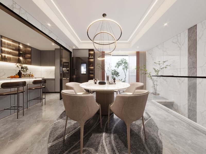 白色亮光岩板餐桌,点缀以轻奢北欧圆环吊灯,精致而不繁复,代表着业主对于高品质生活的追求,岛台的加入,休闲区的打造,氛围灯带的点缀,在优雅静谧的空间里,时光也变得柔软轻缓。