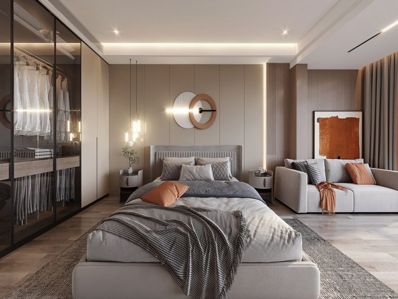 卧室沿用整体空间的暖色基调,增加灯光的运用,用金属、绿植、摆件等元素点缀,少了几分理智克制的冰冷。